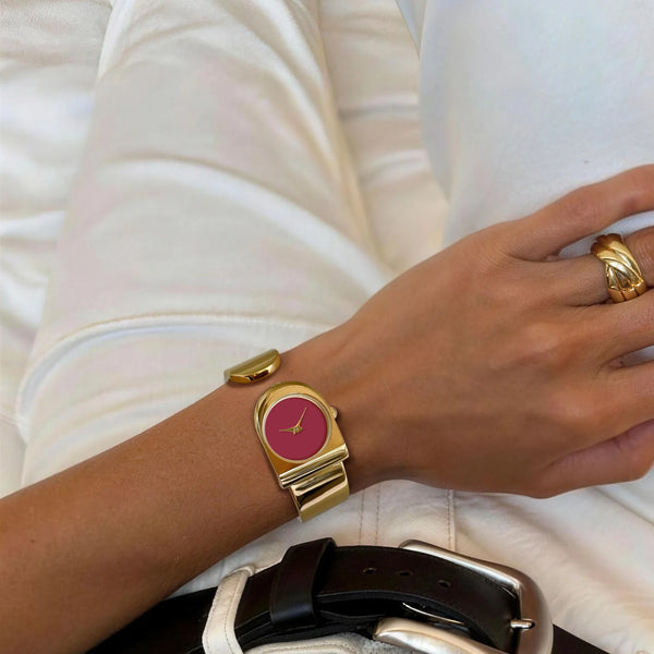 Made from gold-plated stainless steel, it combines durability and elegance in a 29 mm design that is ideal for a sophisticated, feminine style. The adjustable strap offers a comfortable and secure fit, adapting perfectly to your wrist.